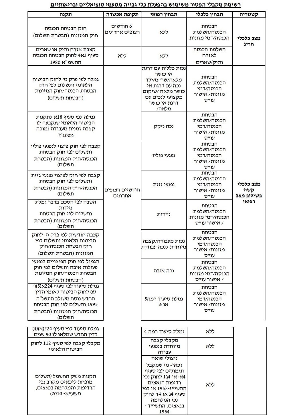 כמו כן, מצ"ב הטבלה, המופיעה בנספח א' למסמך המדיניות, המפרטת את רשימת מקבלי הפטור, כפוף לעמידה בכלל התנאים: